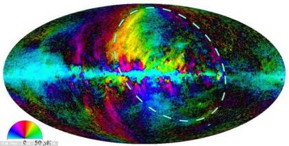 图中圆圈部分是银河系“1号环”结构,不同色彩代表着磁场角度,不同亮度代表着信号强度。