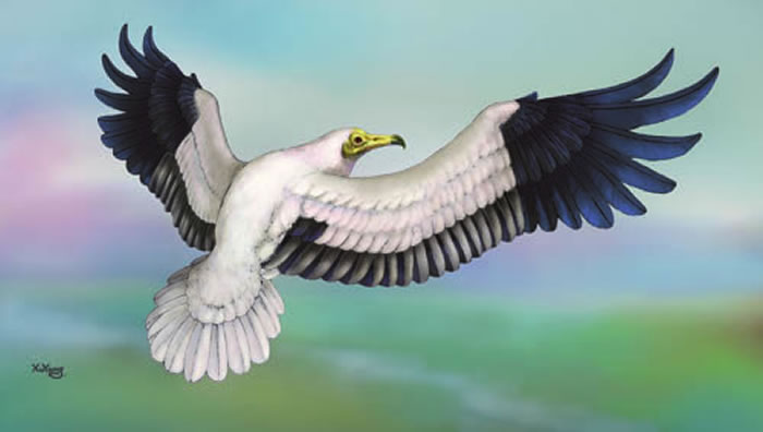 长嘴中新近白兀鹫复原图(许勇绘) 长嘴中新近白兀鹫化石照片和线条图(李志恒供图) 据中国科学院古脊椎动物与古人类