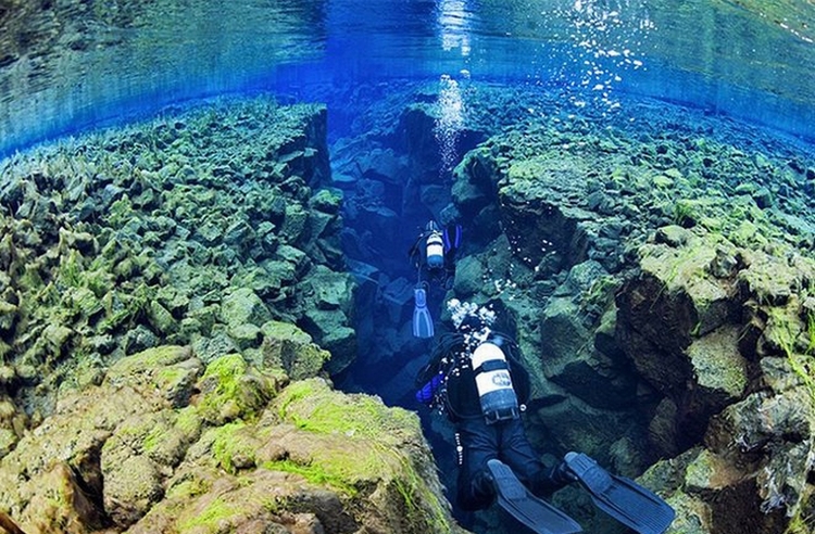 Silfra大裂缝在冰岛辛格韦德利国家公园,底部延伸至议会湖,缝隙间充满了清透见底的湖水。