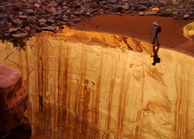 徒步者仿佛站在犹他州的峡谷边上,实际上是在河床上行走。