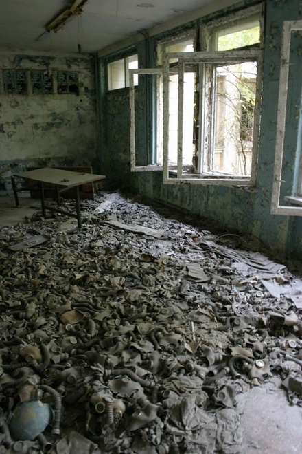 切尔诺贝利核电厂附近一所小学内,散落一地的防毒面具,诉说着1986年4月核反应炉爆炸后,发生危急状况的瞬