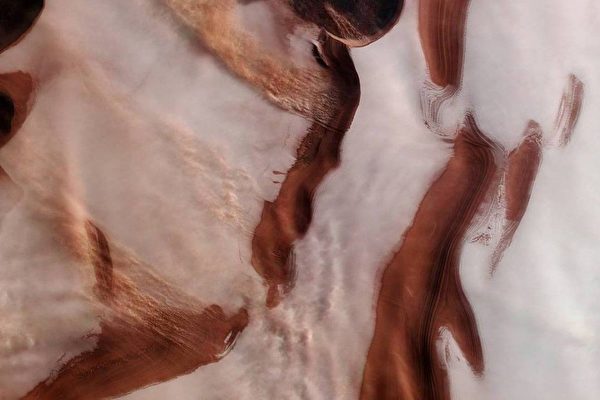 欧洲太空局(ESA)公布了新拍的一张火星北极冰帽的照片。皑皑白雪的周围露出一部分火星上褐色的土地、条条深邃的沟壑,