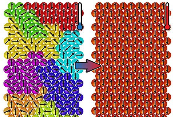 示意图显示特殊磁性材料在加热时从自旋的无序状态(左)变为显示磁性的有序状态(右)。 (Khajetoorians