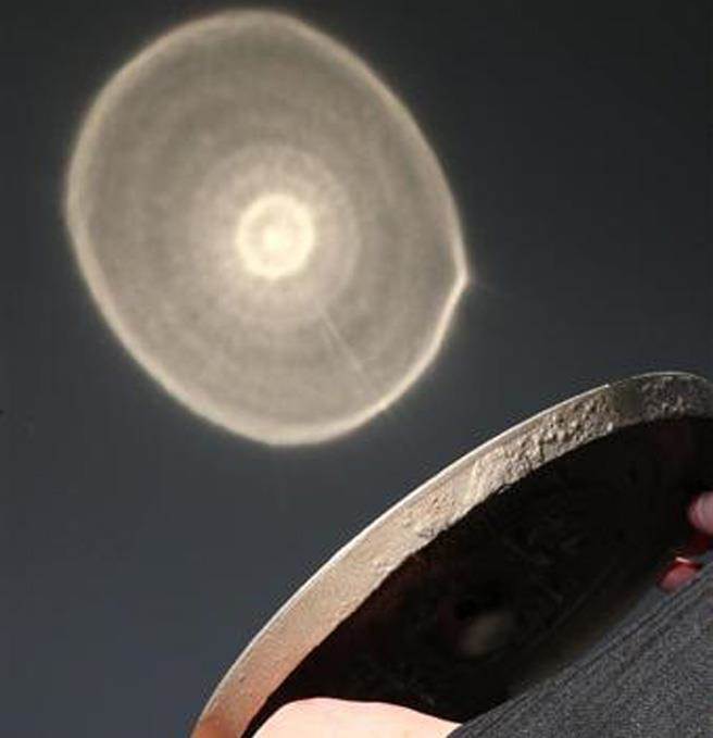 镜面反射到墙上,可以清晰地看到背面的花纹字迹。