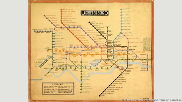 1863 年,伦敦地铁第一次通车。在之后的几十年中,数条铁路线出现,并且纵横交错。但由于私营企业的运营,地铁线路图