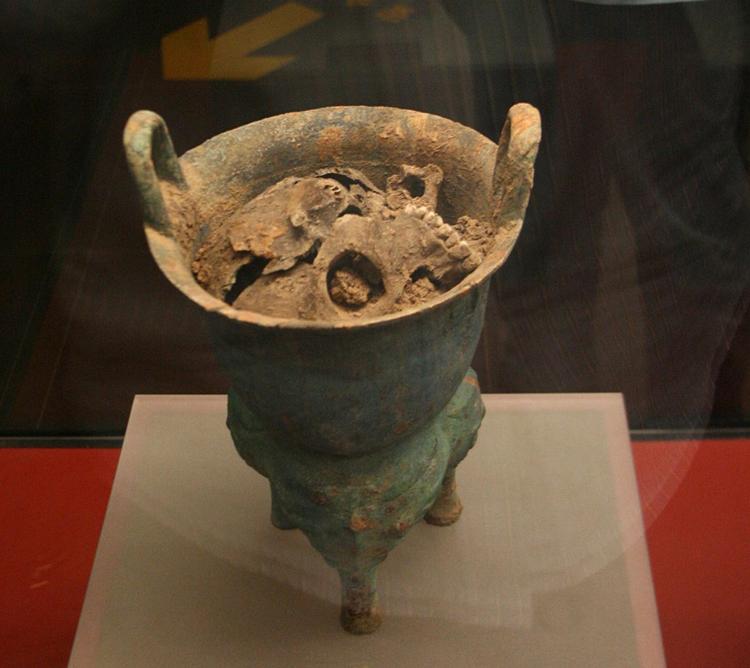 商代有活人祭祀的习俗,不少战争的俘虏被当作“人牲”献祭,在河南安阳的殷墟遗址,还出土了装有15岁少女人头的青铜锅具