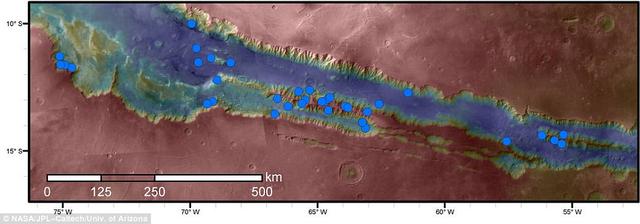 最新发布的研究报告列举了水手号峡谷中部及东部共41个RSL地点的详细观测数据,每个地点的线条从几个到上千