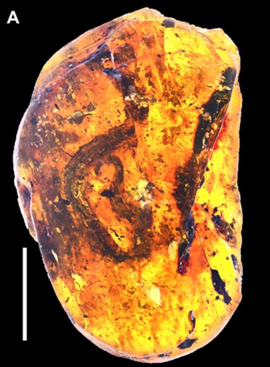 由多国科学家组成的团队,发现仅数厘米长的琥珀中藏有一条小蛇,据分析,这次发现的蛇类化石来自中生代白垩
