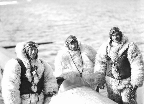 丹麦地质学家LaugeKoch(中)和同事在一架开放式的海因克尔战斗机驾驶员座
