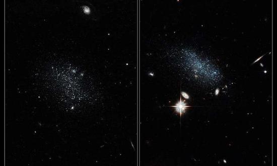 据国外媒体报道,美国宇航局的哈勃太空望远镜近日发现了两个小型矮星系从太空中空旷的区域游荡到了充满星系的区域。