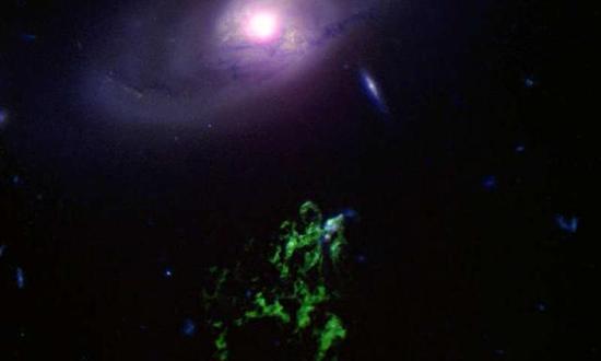 天文学家通过射电望远镜发现了一个水母形状的天体,位于距离地球大约3.4亿光年的地方,伞形的身体、身下的触角一应俱全