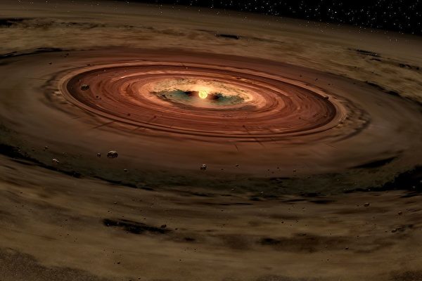 目前的天文认知以为年轻的恒星诞生后,气体尘埃呈盘状环绕其周围,接着再从这些气体尘埃中诞生一个个行星,
