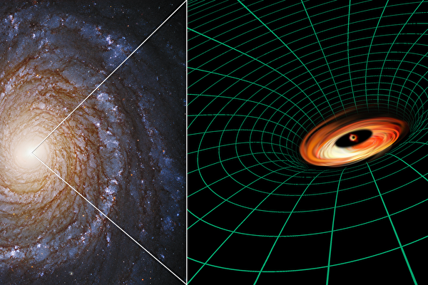 非常靠近黑洞的一个星系团的艺术设想图,右上方为其X光观测图(NASA)