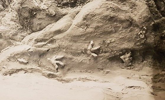 位于澳大利亚昆士兰中部一个火黏土洞穴的顶壁上,有好几组恐龙脚印。其中一些脚印每组四个,而且脚印不是陷入洞顶,而是向