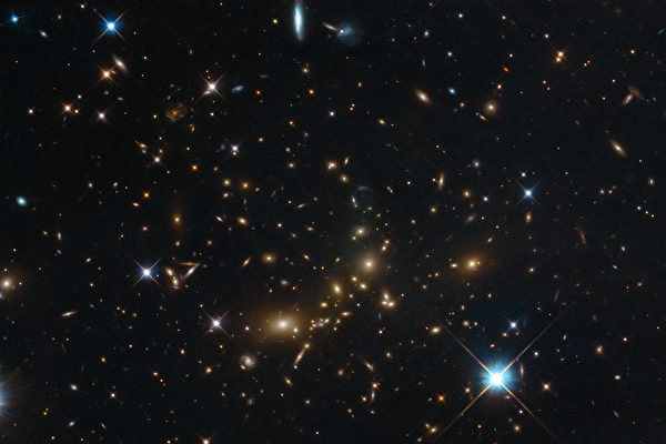 美国国家航空航天局(NASA)拍摄到一个遥远的巨大星系团,在黑暗的太空中闪闪发光,而这里是数不清的星