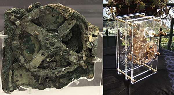 左图为安提基特拉机械的部分残片;右图为2007年重建的安提基特拉机械模型。(公有领域/Mogi Vi