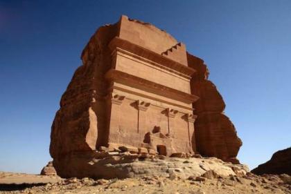 在广阔无边的沙特阿拉伯沙漠中,在沙土之中竟发现到了这样由一个巨石所组成的一座城堡,其外型有简洁的线条,而有棱有角的外型和