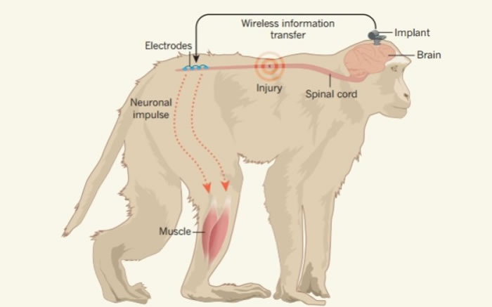 有重大脊椎伤害的瘫痪猕猴能够在遭受到导致残废的伤害后不到六天再度行走,