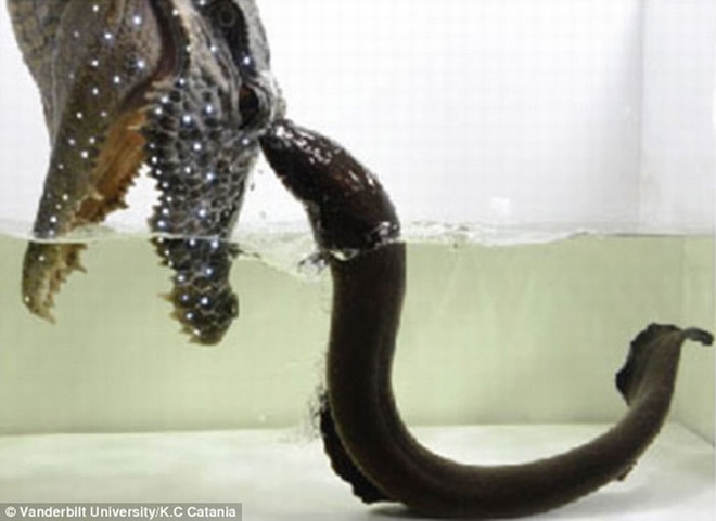 电鳗攻击鳄鱼实验