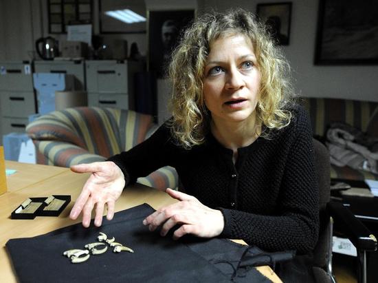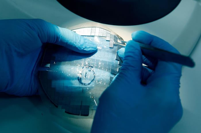 肯道尔正在检查纳米贴。这些矽晶片上带有许多沾附疫苗的细小针刺。 PHOTOGRAPH BY JULIAN K