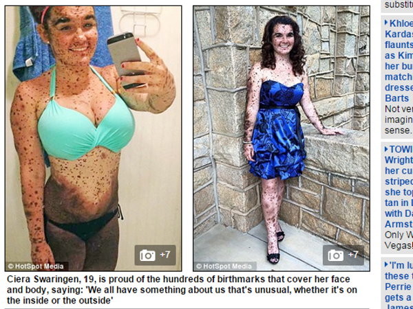 美国一名19岁少女罹患黑色素症,但她仍乐观面对,穿泳装展现自信。