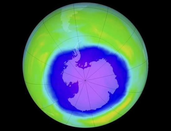 图像显示南极洲上空的臭氧层破洞(蓝色部
