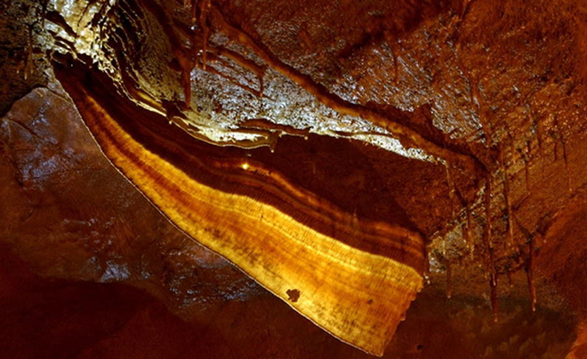 培根岩:这是全球最美丽的洞穴景象之一,洞穴中岩石纹理颇似培根猪肉,它形成于倾斜洞顶饱含水分的方解石,之后变硬成为纤薄