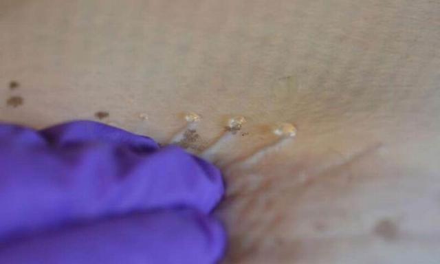 如图所示,研究人员对一条成年鳐鱼腹侧施压,发现从劳伦斯壶腹小孔中渗出胶状物质,最新研究显示,这种胶状物质