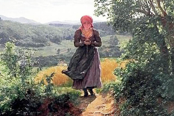油画中的少女,俨然是在郊外一边漫步时一边在滑手机