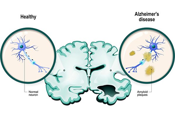 阿兹海默症患者的大脑(右侧)与正常大脑(左侧)的对比图。(Shutterstock)