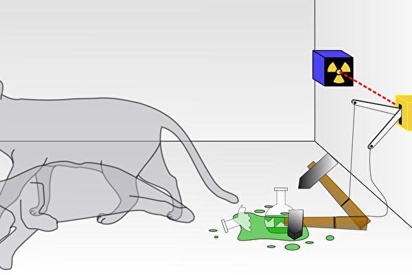 把一只猫、一个装有氰化氢气体的玻璃烧瓶和放射性物质放进封闭的盒子里。当盒子内的监控器侦测到衰变粒子时