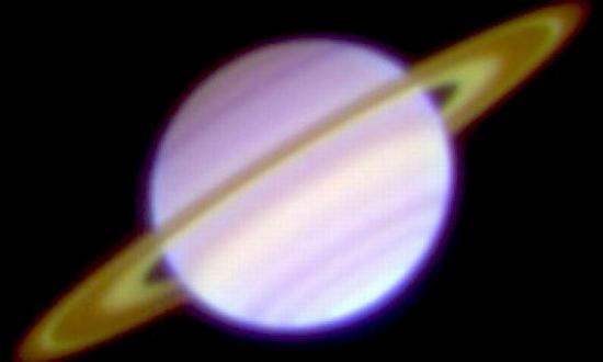 图中是2008年1月23日斯巴鲁望远镜拍摄的三色合成中红外图像,卡西尼环缝和C环结构显得较明亮,色彩差异反映出温度的