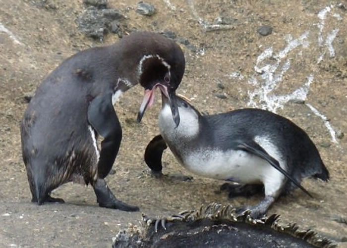 该企鹅在成年后仍会向父母索取食物。(加拉帕戈斯国家公园图片)