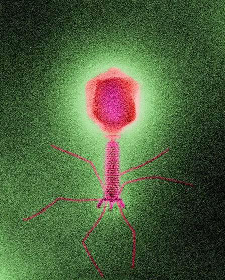 噬菌体:如图所示,这张彩色电子显微图像呈现的是一种噬菌体,它能够攻击威胁人类健康的其它细菌,通常人们