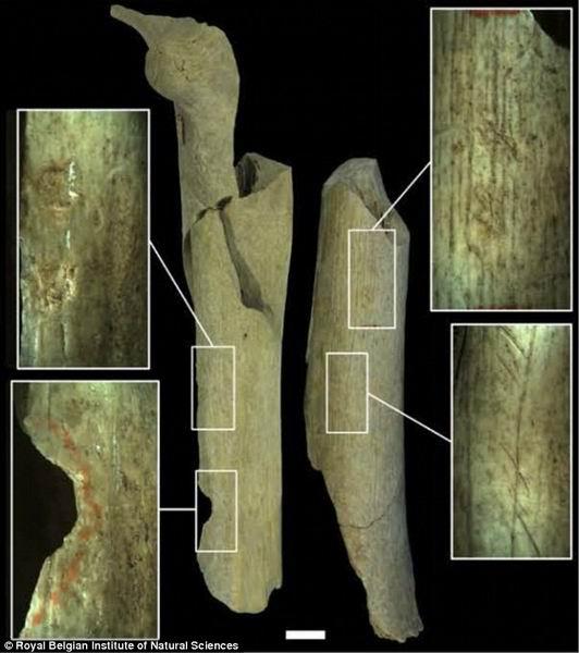 科学家最新研究显示,穴居人曾将同伴尸体随意切割,制成工具,有噬食同类的迹象。图中是骨骼化石上的切割痕迹,