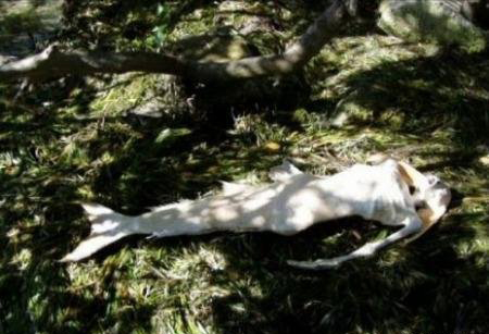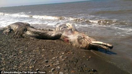 这个有着鸟嘴、尾巴长毛的不明生物遗体被冲到俄罗斯远东地区 (Russian Far East)。科学家尚未