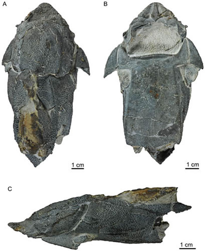 长吻麒麟鱼正型标本(IVPP V20732)照片,背视图(A),腹视图(B),侧视图(C) (朱敏供图)