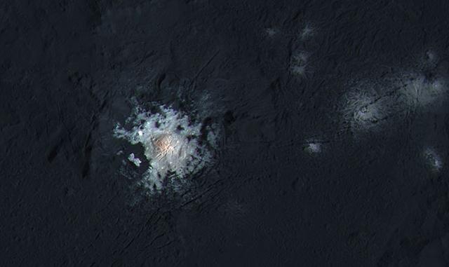 欧卡托撞击坑的增强色照片,撞击坑中心亮斑与周围物质明显不同。