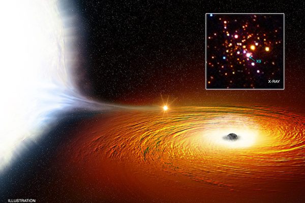非常靠近黑洞的一个星系团的艺术设想图,右上方为其X光观测图(NASA)