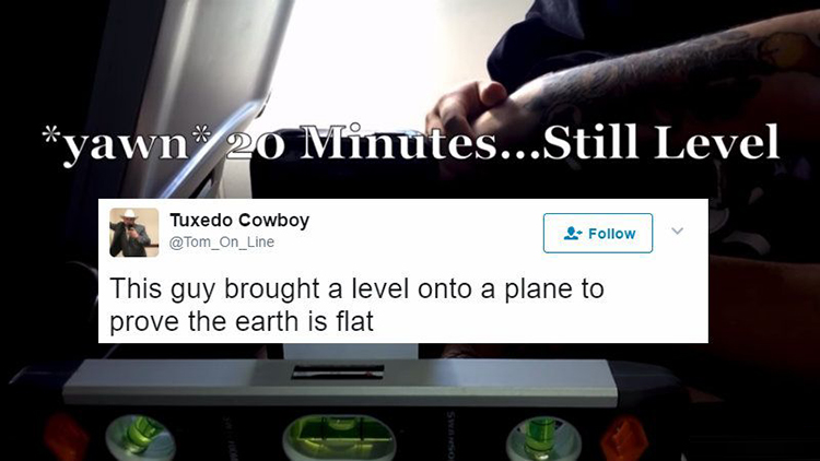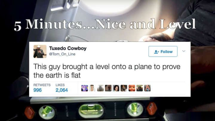 这位“平地球人”深信地球是平的,他怀抱愚蠢的企图,带一个水准器(spirit level)到飞机上,要证明他的理论…