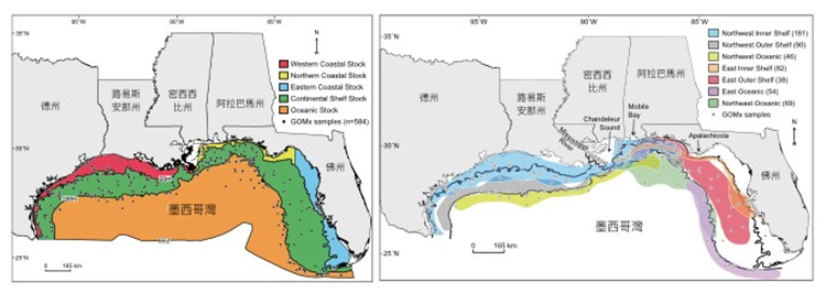 图二:瓶鼻海豚在墨西哥湾北部的族群分布图。左方为现行依照海床等深线配合传统分子遗传研究结果认定的族群 (stock) 结构,右方为更多标本、更高分辨率的分子遗传工具得到的族群结构。原本认为属于同一族群的离岸族群 (Oceanic Stock, 左图橘色区块),在最新的研究里发现应该至少包含三个族群: Northwest Oceanic (右图芥末绿区块)、Northeast Oceanic (右图草绿区块) 和 East Oceanic (右图紫色区块); 从密西西比州的 Chandeleur Sound 到 佛州的 Apalachicola 间的族群构造,也比之前所知的还要复杂。
