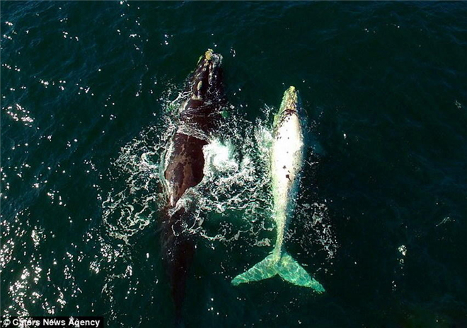 目前,无人机在南非海域拍摄到一头罕见的白化鲸鱼与母亲一同游水,它们是南方露脊鲸,在海洋中发现白化鲸鱼是非常难得的。