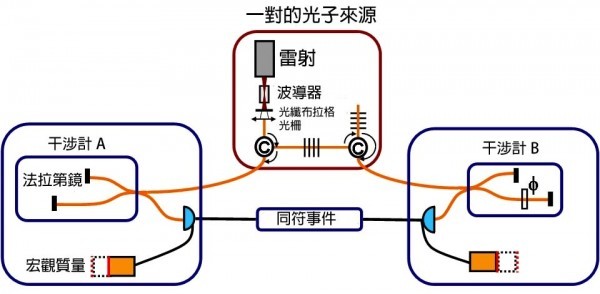 直线两端的实验室Alice和Bob制造一个光子和一个电子组成的纠缠态。电子被保留在钻石晶格之中,而光子则送至1.3公里直线中间第三实验室( 且称Juanita)。Alice 和Bob分别选择一组设定来测量电子,而Juanita则执行两个光子的测量。