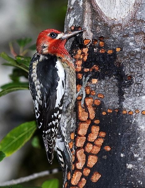 除了拼命打洞之外,还有另一种“吸汁啄木鸟”(Sapsucker),被称为森林中的吸血鬼,喜欢吸取汁液。吸汁啄木鸟会挑选健康、糖份高的树木,如枫树、桦树等等。啄木鸟在树干上啄出许多小洞,洞与洞之间宽度不超过1厘米,360度环绕整支树干。最后,这些孔洞渗出的树汁,会吸引其他害虫前来吸食、产卵、繁殖,直到树木死亡。