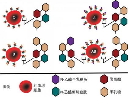 A、B、O血型的最大差异就是红细胞表面所带的结构略有差异的糖链,A和B两种血型的红细胞表面都有额外的一个糖分子。