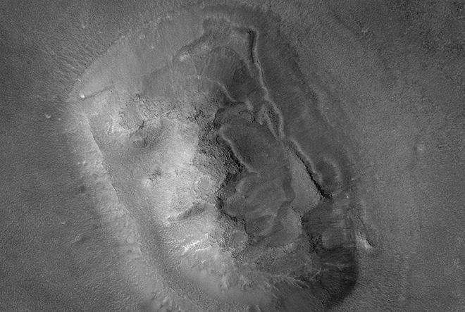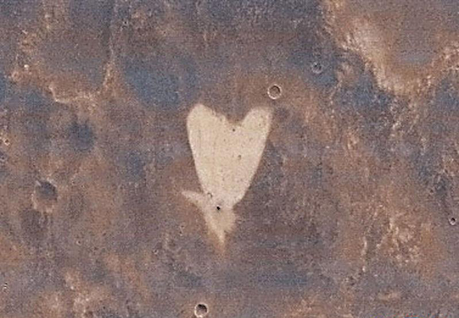 2010年5月美国宇航局的火星勘测轨道飞行器(MRO)在火星北半球的阿拉伯高地拍摄到了这个心形图案。