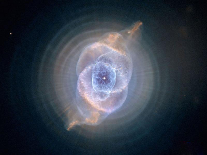 哈勃太空望远镜拍摄到的这张星云照片看起来就像一只猫的眼睛。这个星云事实上是由一颗濒亡恒星(瞳孔处)形成的。这颗恒星不断向尘埃层(酷似虹膜)喷吐大量物质。
