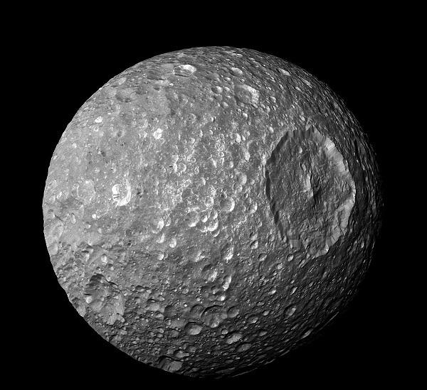 美国宇航局的卡西尼号飞船在2010年2月13日拍摄到了土卫一的这张照片。星球表面的赫歇尔陨石坑让它看起来与《星球大战》中的死星极其相似。