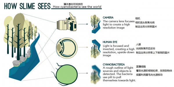 虽然蓝藻细胞和有视力的动物(比如人类)这一行为结果(即通过感知光线在环境中导航)是一样的,但是实际的生物学远离是非常不同的。这显而易见,因为蓝藻细胞是单细胞生物,而一个人类的视网膜就包含了几百万个细胞。但是,令人称奇的是,人眼和蓝藻细胞能够以类似的方式进行观察。