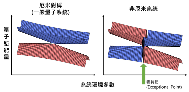 什么是厄米和非厄米系统?周齐使用量子粒子在晶格结构内不同地点跳跃的情形举例解释。如果它向左和向右跳跃的几率是相同的,这就是厄米哈密顿(Hamiltonian)系统;如果向两个方向跳跃的几率不同,就是非厄米哈密顿系统。哈密顿是量子力学中用到的一个运算量,对应于系统的总能量。